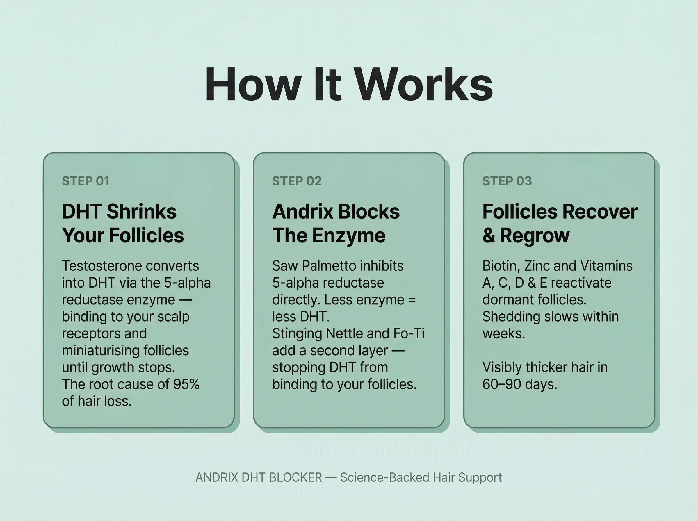 Most supplements treat the symptoms. Andrix targets the hormonal root cause — blocking DHT before it reaches your follicles, while flooding your scalp with the nutrients it actually needs to regrow.
